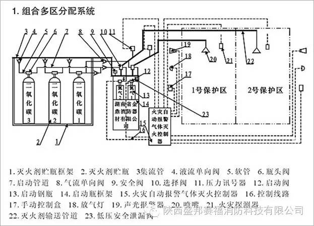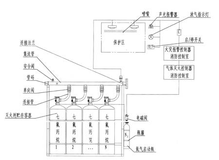 七氟丙烷滅火系統(tǒng)主要部件有:儲(chǔ)存滅火劑容器、儲(chǔ)存啟動(dòng)氣體容器、容器閥、單向閥、連接管、安全泄壓閥、選擇閥、信號(hào)反饋裝置、集流管、電磁閥、壓力顯示器、管路、噴嘴。